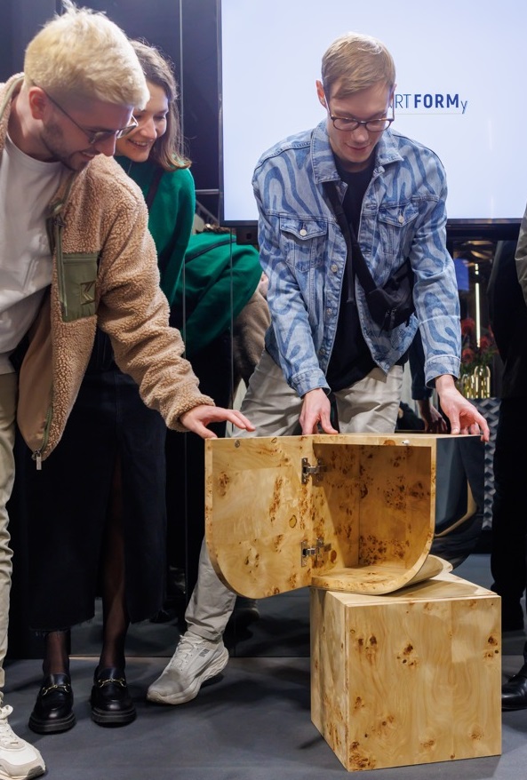Mikołaj: Jesteśmy z Poznania i tu głównie pracujemy, dlatego nasza pierwsza styczność ze Studiem Prostych Form była właśnie w konkursie „ArtFormy”. Studio Prostych Form to ludzie z ogromną wiedzą i pasją. Doświadczeni architekci i technolodzy, którzy nie boją się wyzwań, potrafią rozmawiać i współpracować. Jesteśmy cały czas w kontakcie. Komunikacja była klarowna i byliśmy informowani na bieżąco o postępach. Mebel widzieliśmy na żywo dopiero na targach, bo ten okres w branży jest bardzo gorący. Byliśmy zaskoczeni płynnym obrotem mebla. Po targach wiemy, co chcielibyśmy ulepszyć, myślimy o nowych kolorach. Bardzo się cieszymy, że możemy działać w tym temacie ze SPF i będziemy kontynuować rozwój. To ludzie z ogromną wiedzą i na pewno to dopiero początek naszej współpracy.