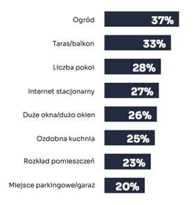 Na poczucie szczęścia w miejscu zamieszkania wpływa wiele czynników. Na szczycie listy atrybutów, które uczestnicy badania wskazywali jako najważniejsze przy wyborze mieszkania lub domu znajduje się ogród. Taką odpowiedź podało 37% respondentów. Na drugim miejscu, z wynikiem 33%, uplasował się taras lub balkon.