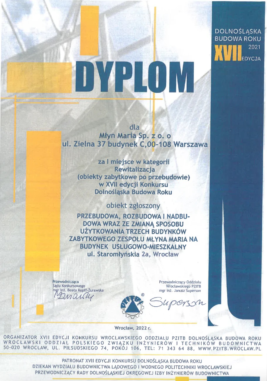 Mimo trudnej sytuacji na rynku branża budowlana nie zwalnia tempa. Nieustannie powstają nowe projekty, które zachwycają innowacyjnością, wyjątkowym charakterem i funkcjonalnością. Każdego roku najlepsze realizacje nagradzane są w konkursie „Dolnośląska Budowa Roku”. W tej edycji uwagę jurorów przykuła rewitalizacja zabytkowego Młyna Maria dokonana przez firmę RealCo. Czym charakteryzuje się ta inwestycja?