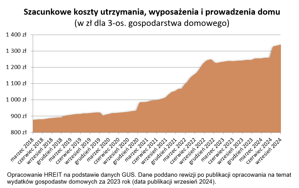 Najnowsze dane GUS pozwalają oszacować, że na utrzymanie, wyposażenie i prowadzenie domu statystyczna 3-osobowa rodzina wydaje około 1330 złotych – wynika z najnowszych wyliczeń HREIT opartych o dane GUS. To o 98 złotych więcej niż w analogicznym okresie przed rokiem. W naszych kalkulacjach uwzględniamy wydatki na ogrzewanie i nośniki energii, ale też inne media, czynsze płacone przez najemców, wywóz nieczystości, zakup AGD, mebli, oświetlenia, dekoracji, ale też koszty usług takich jak sprzątanie czy naprawy i remonty.