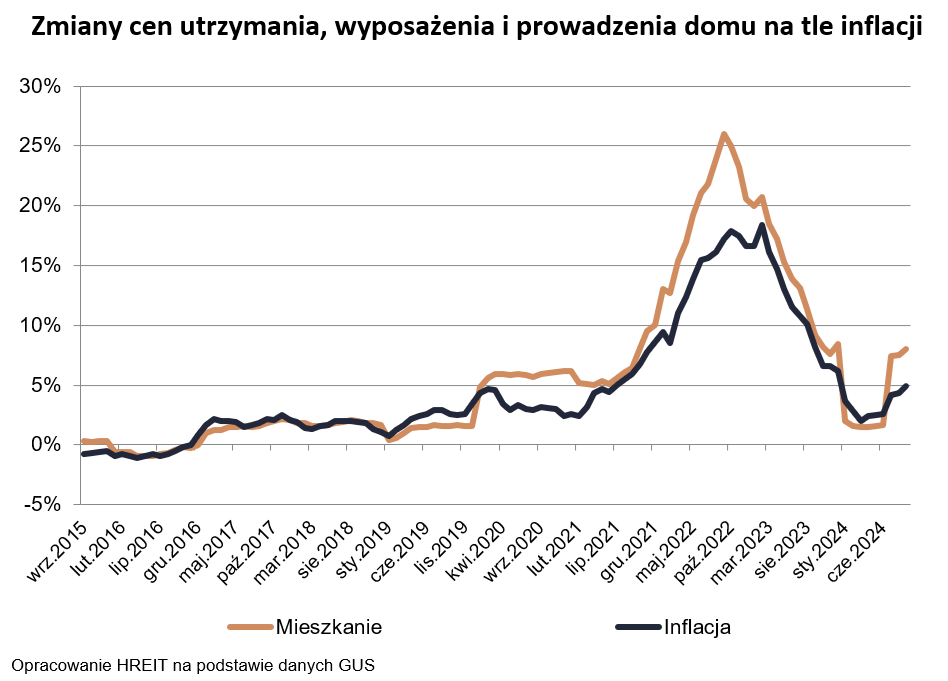 W przypadku dóbr i usług, składających się na koszty związane z mieszkaniem, mamy do czynienia z prawie dwukrotnie szybszym tempem podwyżek niż to oszacowane dla wszystkich dóbr i usług konsumpcyjnych. Chodzi po prostu o to, że koszty utrzymania i prowadzenia domu rosną szybciej (8% r/r) niż sugeruje ogólna inflacja (4,9%).