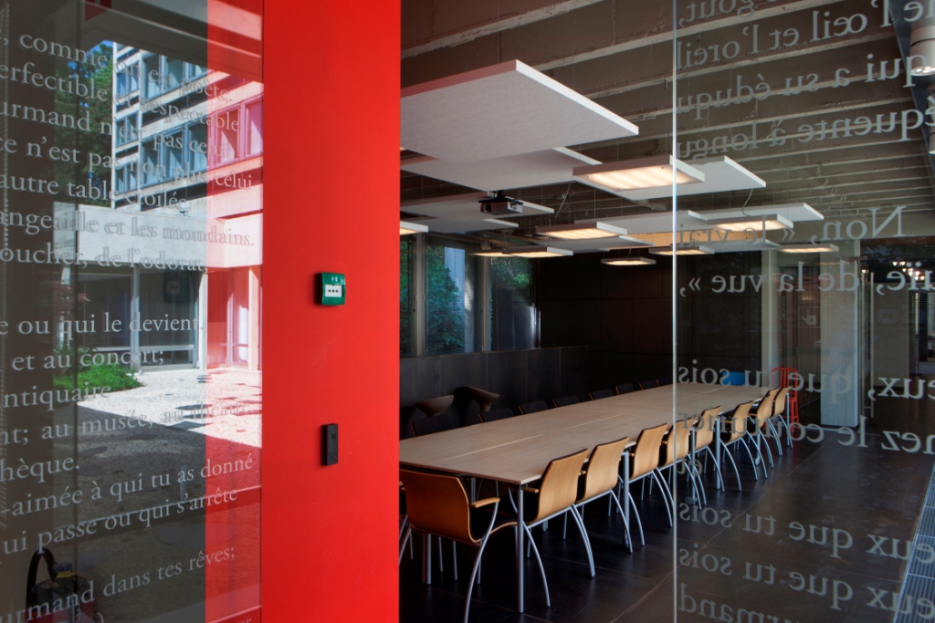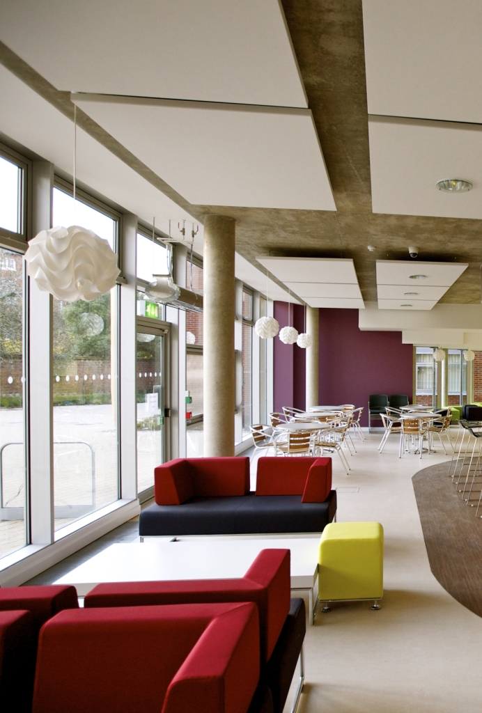 rockfon_Chichester 33 cr_wwwDoskonale nadają się do pomieszczeń, w których w systemie ogrzewania i chłodzenia istotną rolę odgrywa bezwładność cieplna stropu i związana z zawartą w nim tzw. masą termiczną. Wyspy podwieszone na linkach nie ograniczają cyrkulacji powietrza, a tym samym naturalnej wymiany ciepła – jego przejmowania od stropu (jeśli temperatura w pomieszczeniu jest niższa) lub oddawania (kiedy temperatura jest wyższa). Przyczyniają się do racjonalizacji zużycia energii. Z tego właśnie powodu na montaż wysp akustycznych Rockfon Eclipse w swoim nowym budynku w Pekinie zdecydowała się firma Velux. Siedzibę firmy wybudowano z wykorzystaniem pochyłych ścian zewnętrznych, w których zamontowano ścienne i dachowe okna. Zastosowano też masę termiczną. Ponieważ wymiana ciepła pomiędzy masą termiczną, a pomieszczeniem wymaga swobodnego przepływu powietrza, pod stropem umieszczono nie klasyczny modułowy sufit, ale wyspy sufitowe Rockfon. Poza tym, że gwarantują wymagany obieg powietrza dają także silne rozprzestrzenianie wpadającego przez okna światła słonecznego w całym budynku.