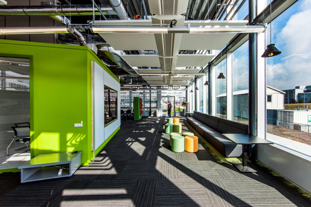 rockfon_Park-20-20 Fox 882_wwwWyspy umożliwiają projektantom zabawę z modułami i kształtami, zmianę wysokości montażu i kątów podwieszenia. Dzięki temu architekci tworzą własny styl w przestrzeni. Ważny jest także nowoczesny charakter wizualny takiego rozwiązania akustycznego. Wyspy Rockfon Eclipse montowane są na praktycznie niewidocznych, stalowych linkach, sprawiając wrażenie jakby swobodnie unosiły się w powietrzu. Ich główne zadanie to pochłanianie dźwięków, i w następstwie zmniejszenie pogłosu w pomieszczeniach. Ponieważ zawieszone są poniżej podstawowego sufitu pochłaniają fale dźwiękowe padające na nie z obu stron. Zaletą jest także to, że odbijają światło. Gładka, biała powierzchnia posiada współczynnik rozproszenia światła na poziomie 86 proc.