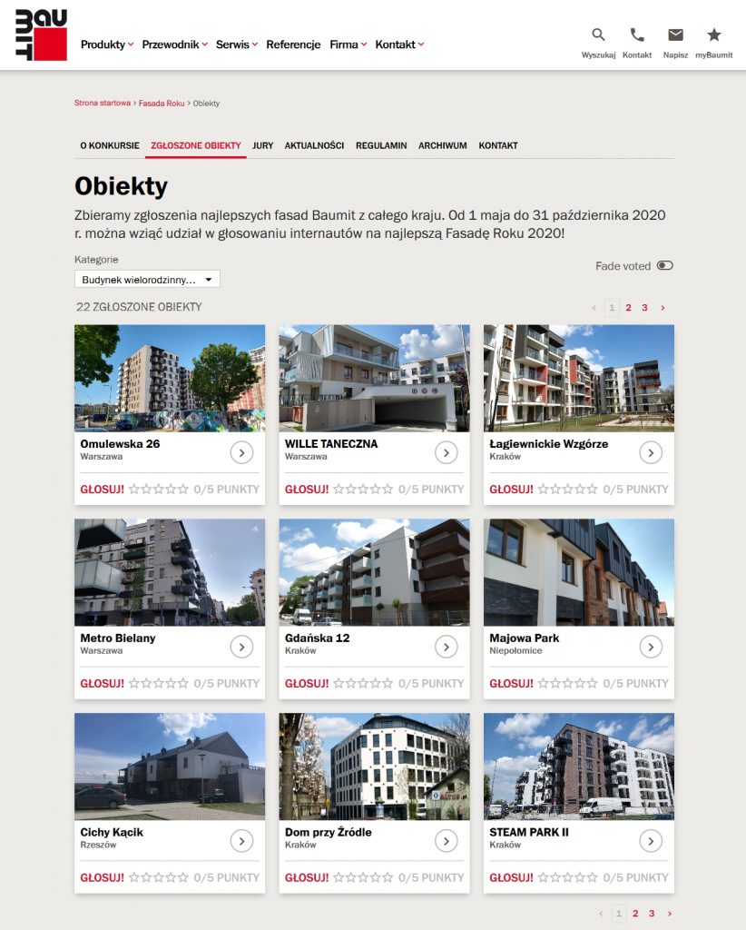 1 maja br. na stronie www.fasadaroku.baumit.com wystartował plebiscyt, który potrwa do 31 października br. Głosować jak w poprzednich edycjach może każdy, ale już nie tylko na jeden – jak to było do tej pory – a na dowolną liczbę obiektów w poszczególnych kategoriach. Nowością jest również możliwość nadawania swoim głosom wag od 1 do 5, w zależności od tego, który obiekt podoba nam się bardziej od drugiego. Realizacje, które zajmą pierwsze miejsce w swojej kategorii, zdobywając największą ilość głosów, zostaną uhonorowane „wyróżnieniem internautów”.