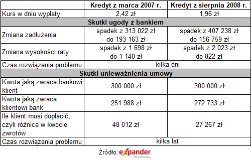 Dla kredytobiorcy takie rozwiązanie miałoby zarówno zalety jak i wady. Z wyliczeń Expandera wynika, że w przypadku kredytu udzielonego w sierpniu 2008 r. przy kursie wynoszącym 1,96 zł, ugoda zmniejszyłaby zadłużenie z obecnych 407 238 zł do 156 759 zł. Rata spadłaby z 2 023 zł do 822 zł. Wadą ugody jest natomiast to, że w przypadku unieważnienia umowy przez sąd, kwota do spłaty spadnie znacznie bardziej, bo do 27 267 zł. Na taki efekt trzeba jednak czekać wiele lat.