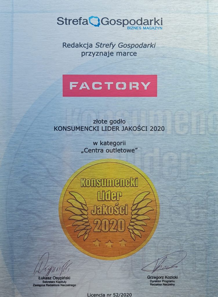 Outlety FACTORY zdobyły Złote Godło Konsumenckiego Lidera Jakości 2020. To prestiżowe wyróżnienie przyznają uczestnicy specjalnego badania, które wyłania najlepsze marki i produkty w poszczególnych kategoriach. FACTORY zdecydowanie zwyciężyło w grupie centrów outlet, zdobywając 36 procent głosów.
